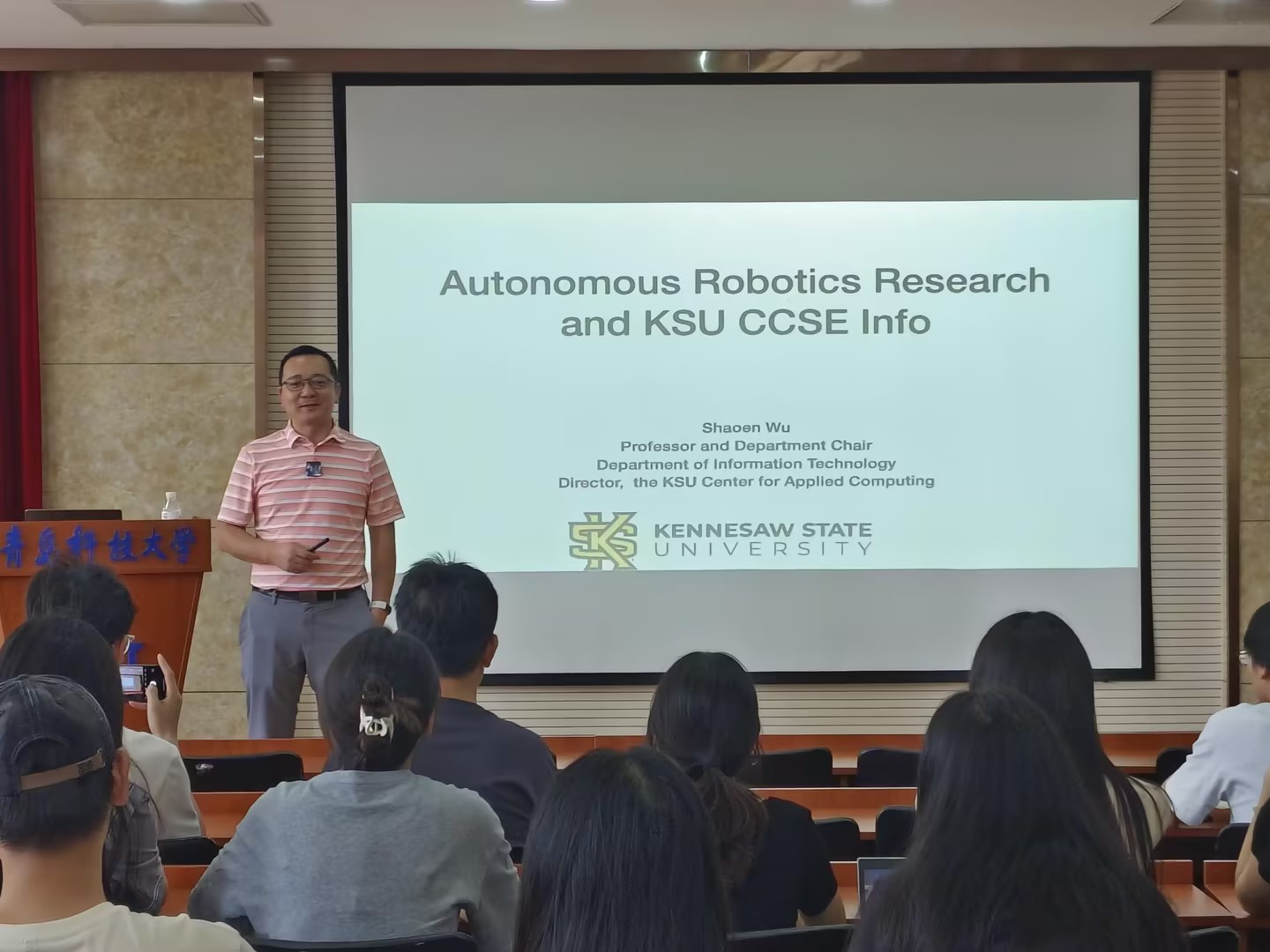 6月24日上午,美国肯尼索州立大学伍绍恩教授在D2-402为学院师生作题为“跨模态推理自主机器人”的学术报告,并就相关前沿问题进行了深入探讨。报告由学院副院长陶冶教授主持,学院40余名师生参加。